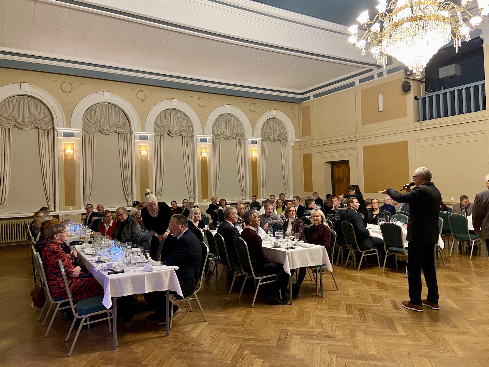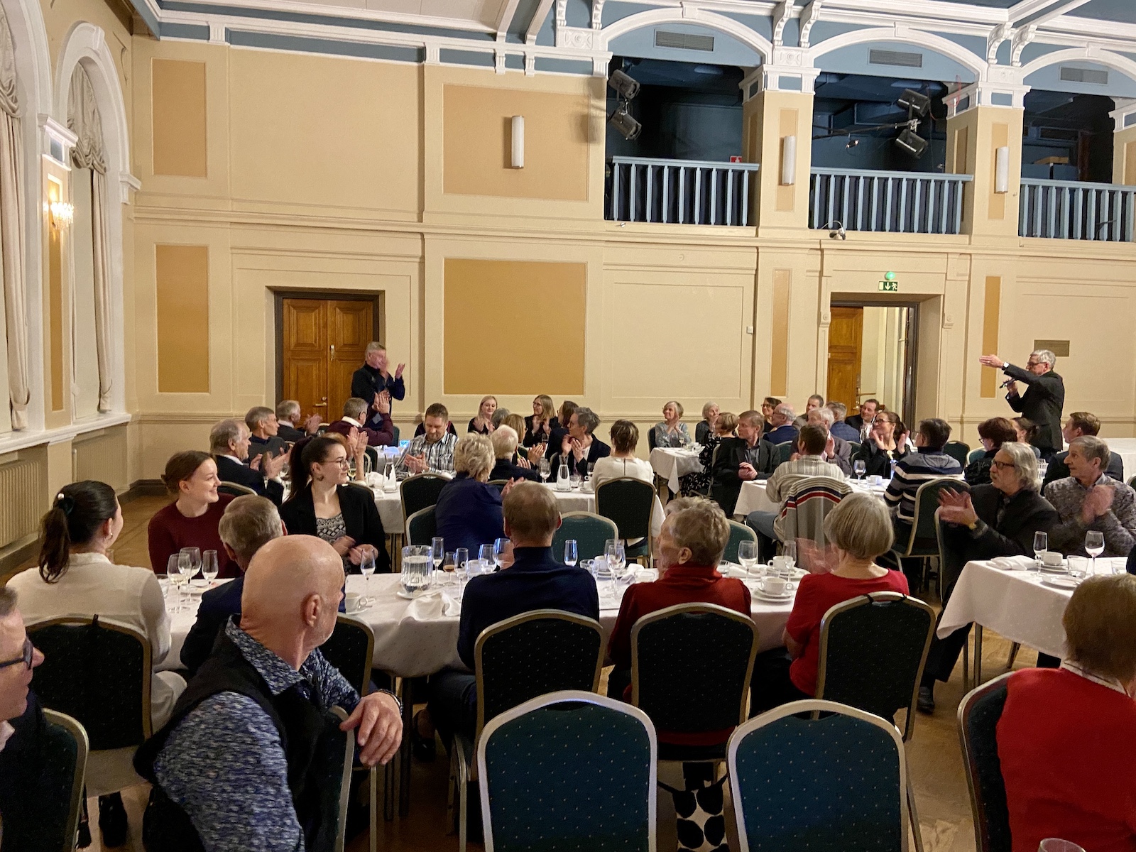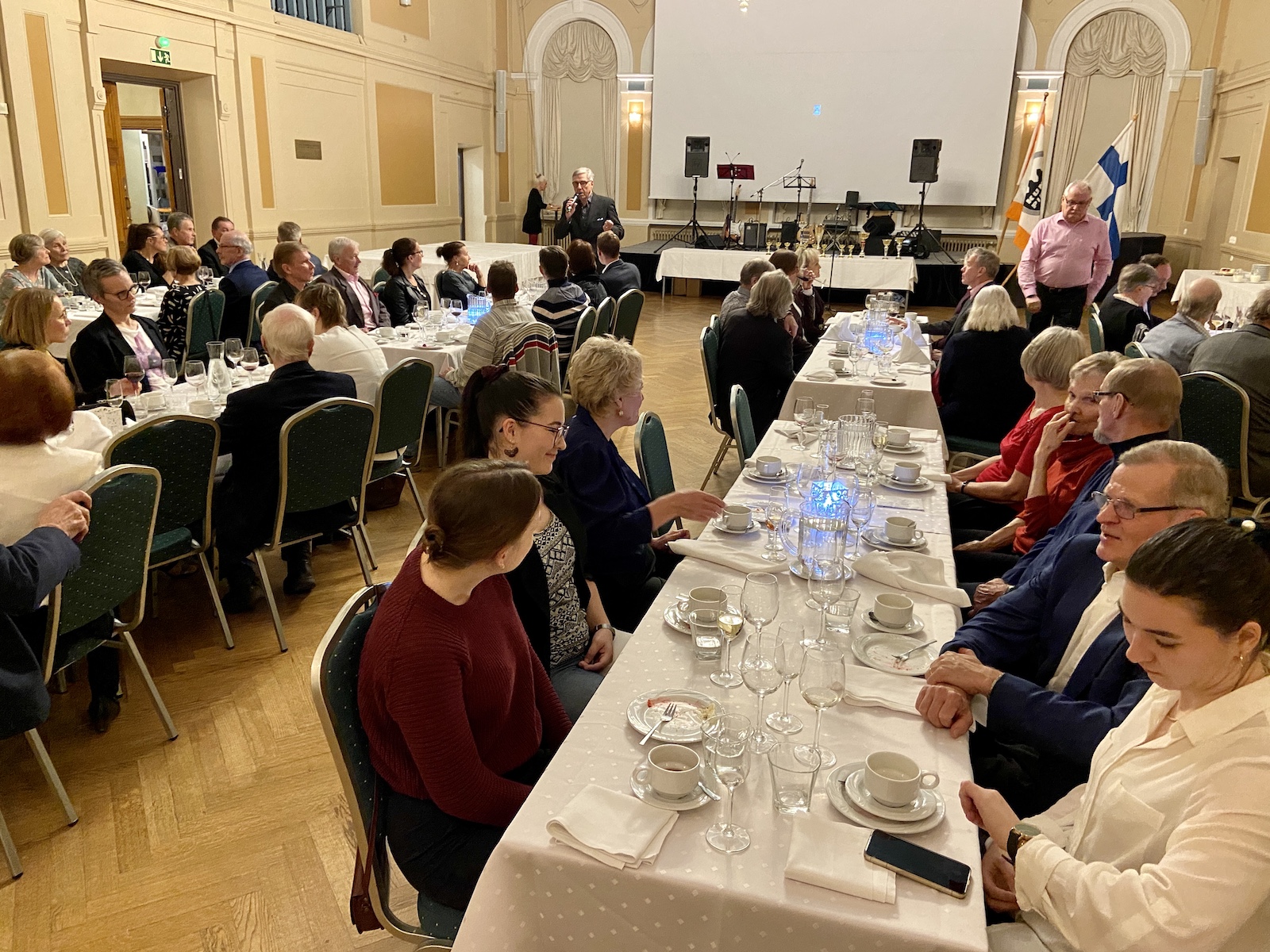 Lämminhenkisessä juhlassa kohotettiin illan aluksi maljat ja sen jälkeen syötiin vatsat pulleiksi herkullista ruokaa.